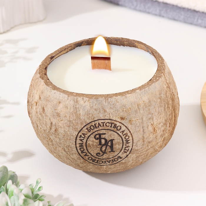 Свеча в кокосе ароматическая, белый чай, соевый воск, 8х10 см, в коробке