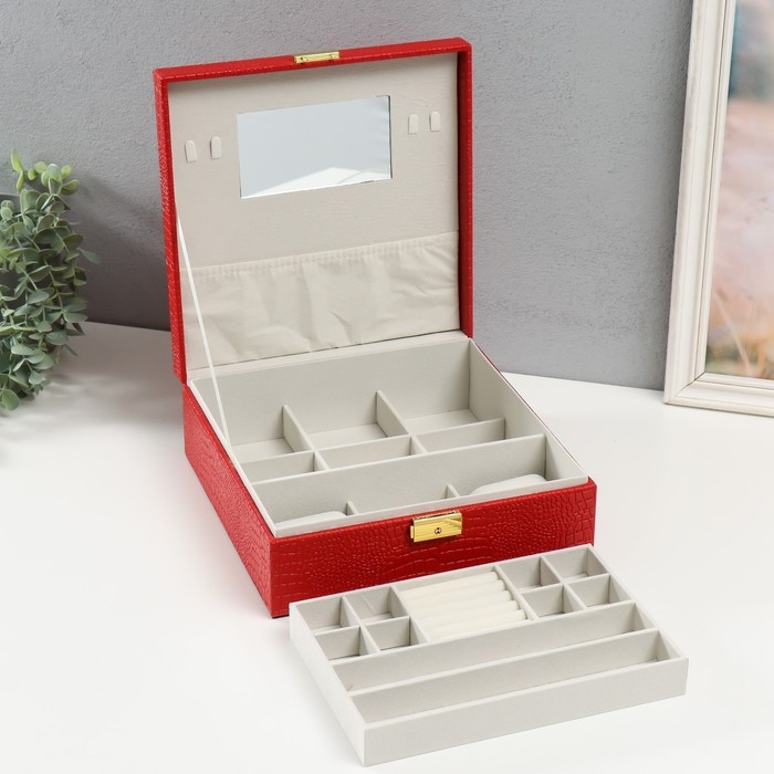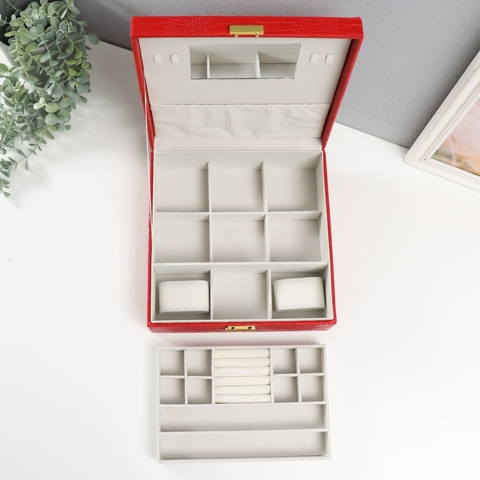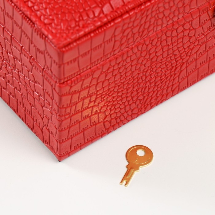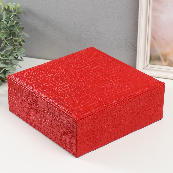 Шкатулка кожзам под часы 2 отделения и бижутерию "Кожа крокодила" красная 26х26,5х10 см