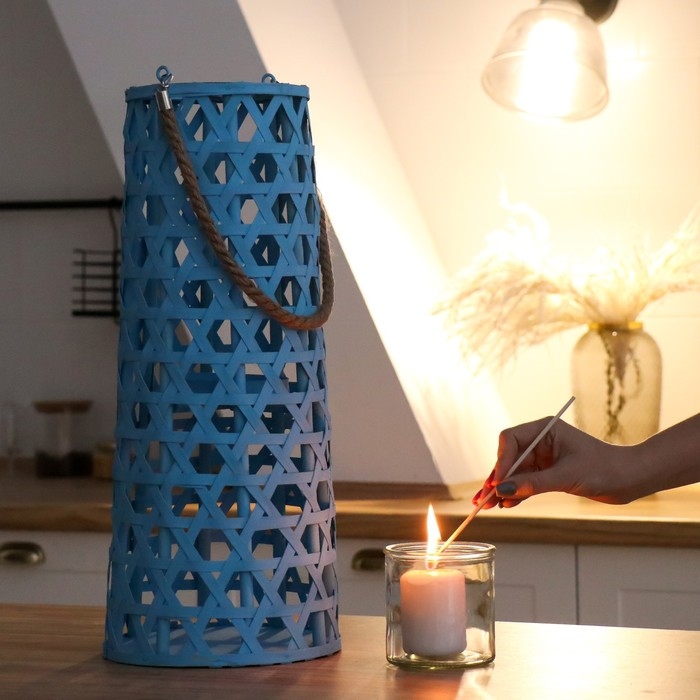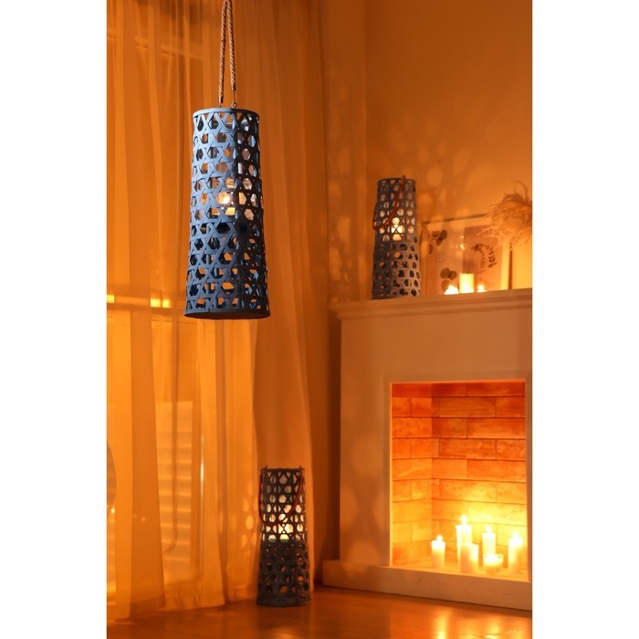 Подсвечник дерево "Фонарик. Звёздное плетение" голубой 51х16х16 см