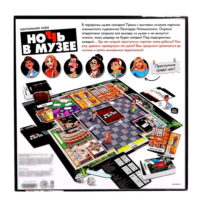 «Ночь в музее» — настольная игра для детей от 8 лет. Ребёнок окажется в центре детективных событий. Сюжет привлечет внимание юного сыщика и погрузит в мир тайн и загадок.