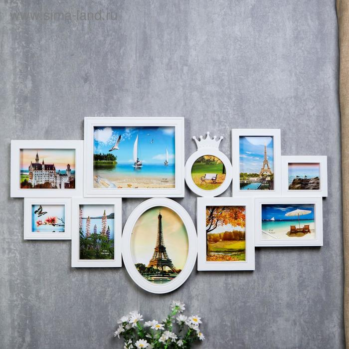 Фоторамка пластик на 10 фото 10х10, 10х15, 13х18, 15х20, 20х25 см "Корона" белая 45х80 см