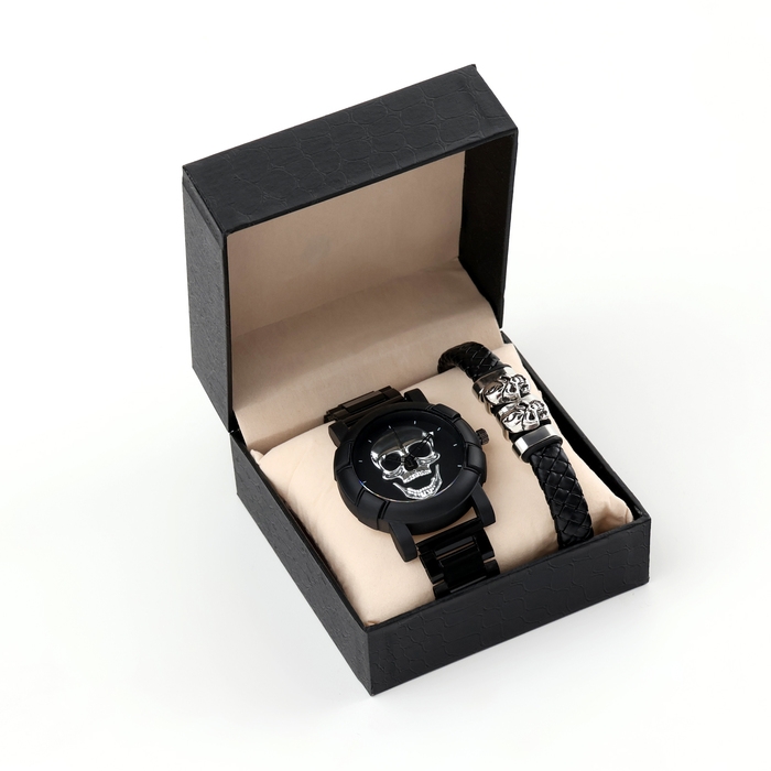 Мужской подарочный набор "Череп" 2 в 1: наручные часы, браслет