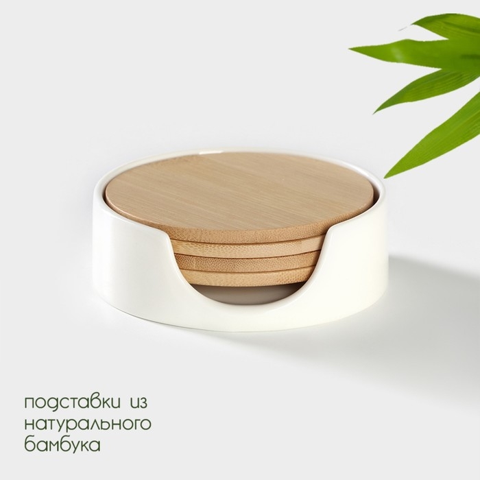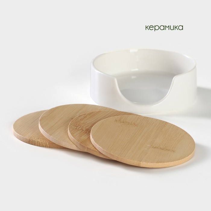 Набор бамбуковых подставок под кружки на керамической подставке BellaTenero, 4 предмета, 9,7×0,4 см