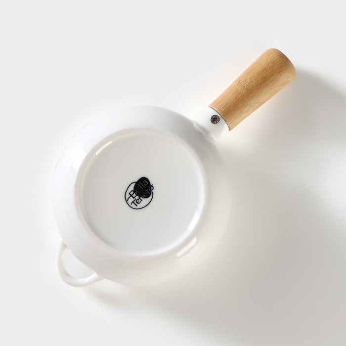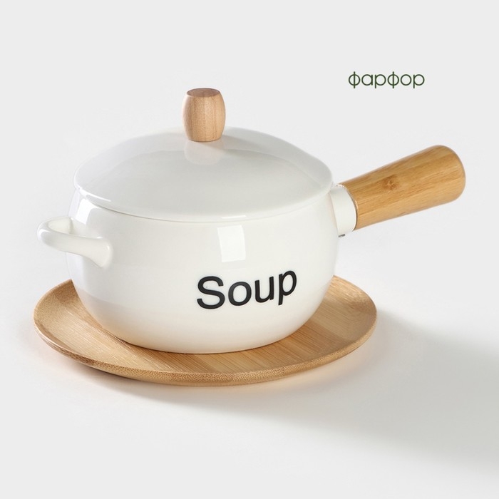 Супница фарфоровая с ручкой на бамбуковой подставке BellaTenero, 400 мл, 20,5×11,5×6,5 см, цвет белый