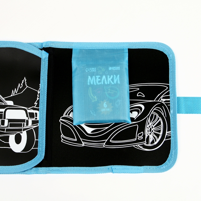 - Внутри книги есть карман для хранения мелков, который можно отогнуть и спрятать внутри сложенной папки.