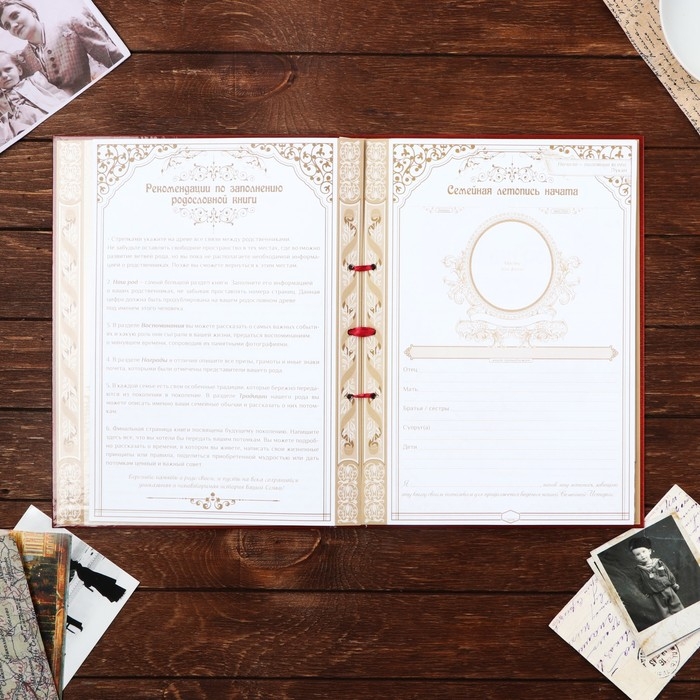 Семья — главное богатство в жизни человека! Сохранить традиции, записать историю поколений и передать их по наследству поможет родословная книга. Она содержит 50 листов (включая инструкции и наименования частей альбома), скреплённых между собой атласной лентой.