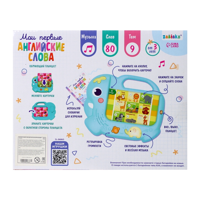 Играя с ним, малыш познакомится с английскими словами, названиями животных, транспорта и разными предметами, а расширит словарный запас и весело проведёт время!