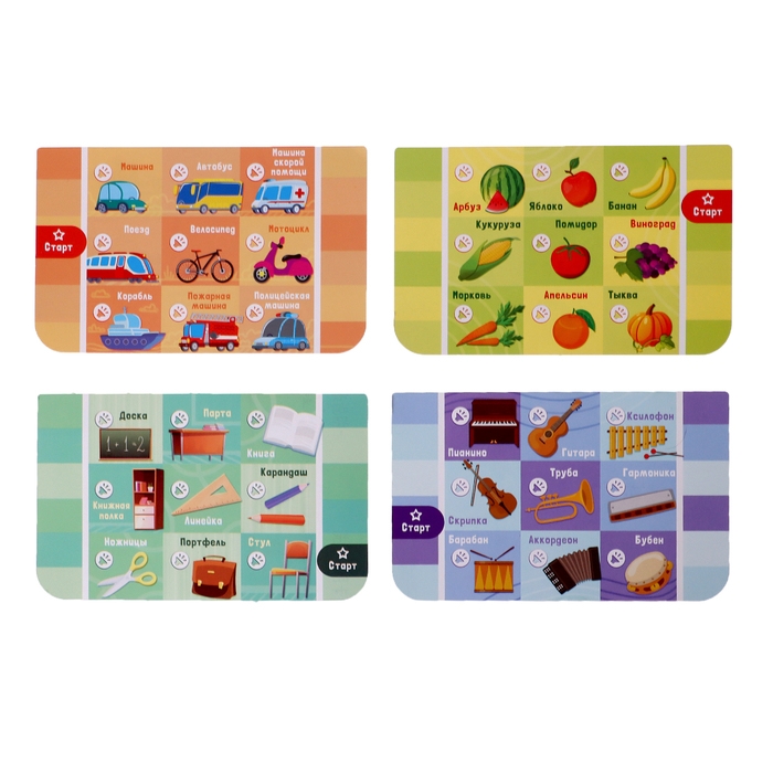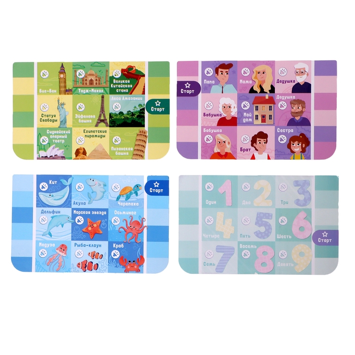 - В комплекте 4 двусторонних карточки: 15 × 0,1 × 9,5 см. Одно из заданий находится на самом планшете.