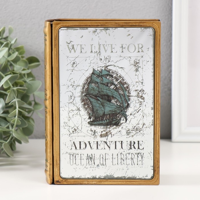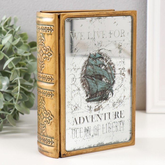 Шкатулка-книга металл, кожзам "Корабль в океане" с зеркалом 17х12х5 см