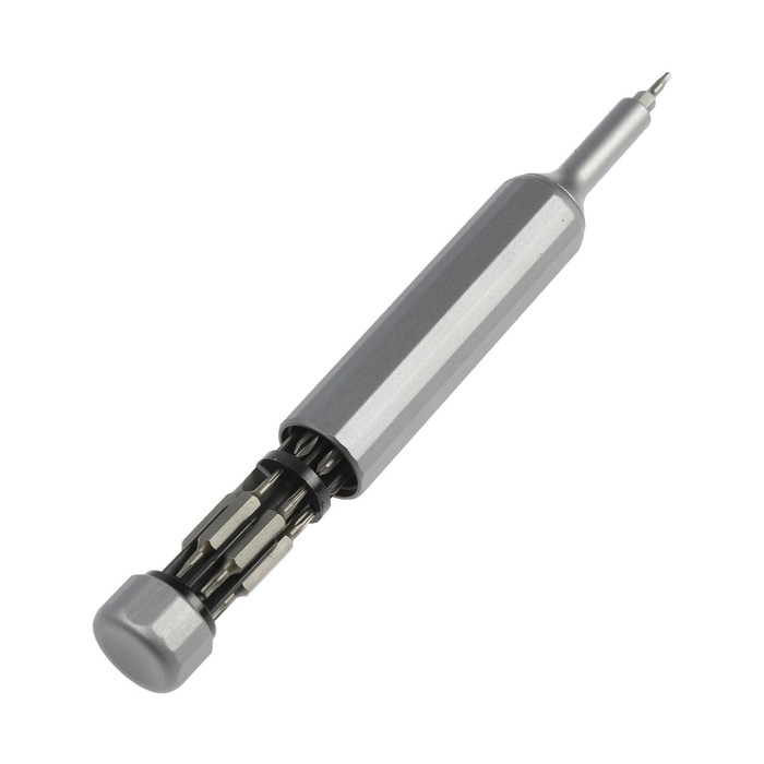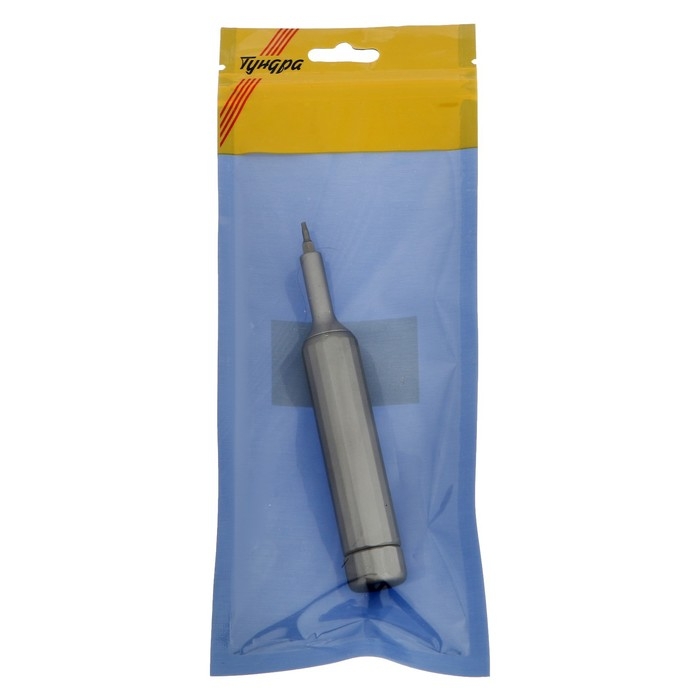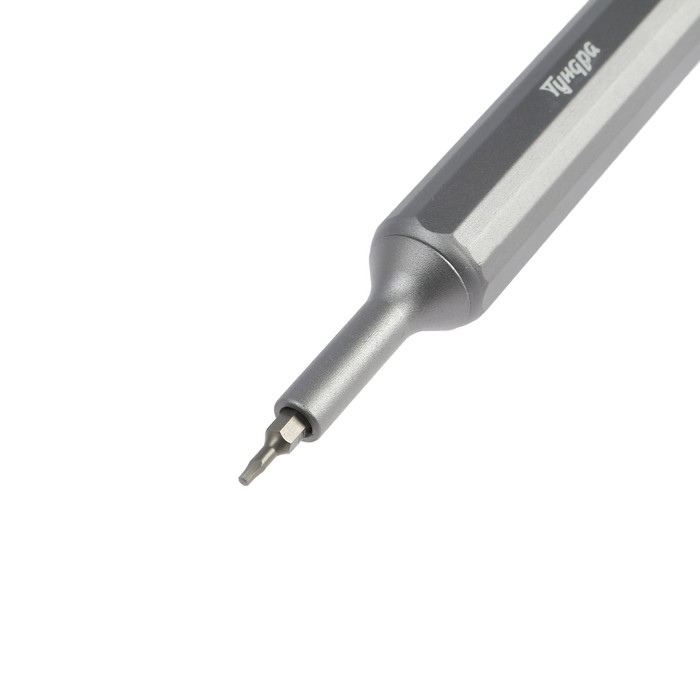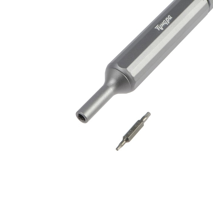 Отвёртка для точных работ «ТУНДРА» оснащена держателем для бит. Он вставляется внутрь самой отвёртки и крепится за счёт магнита. Второй магнит расположен в рабочей части отвёртки, в отверстии, куда вставляется выбранная насадка.
