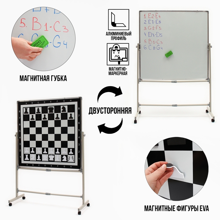 Одна сторона доски является шахматной, что делает ее идеальным выбором для обучающих мероприятий, турниров, для разбора ошибок и стратегий после или перед интеллектуальными соревнованиями. Вторая сторона доски магнитно-маркерная. Магнитные свойства поверхности позволяют использовать изделие в качестве мольберта или крепить наглядные материалы и обучающие карточки на разнообразные магниты. Маркерное покрытие обеспечивает возможность нанесения записей с помощью специальных маркеров, которые легко стираются губкой и не оставляют следов после себя.