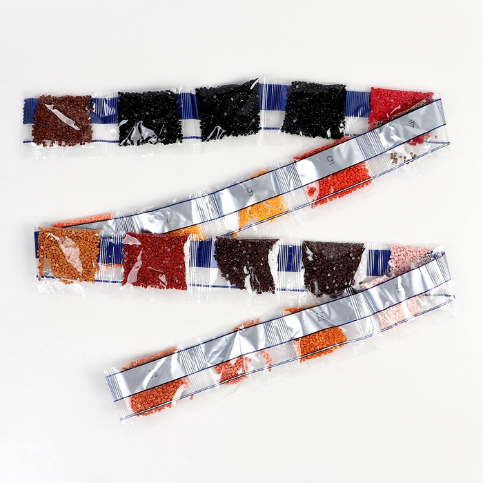 Вам предстоит разложить кристаллики карандашом по пронумерованной схеме. Холст с клеевым покрытием будет надёжно удерживать стразы.