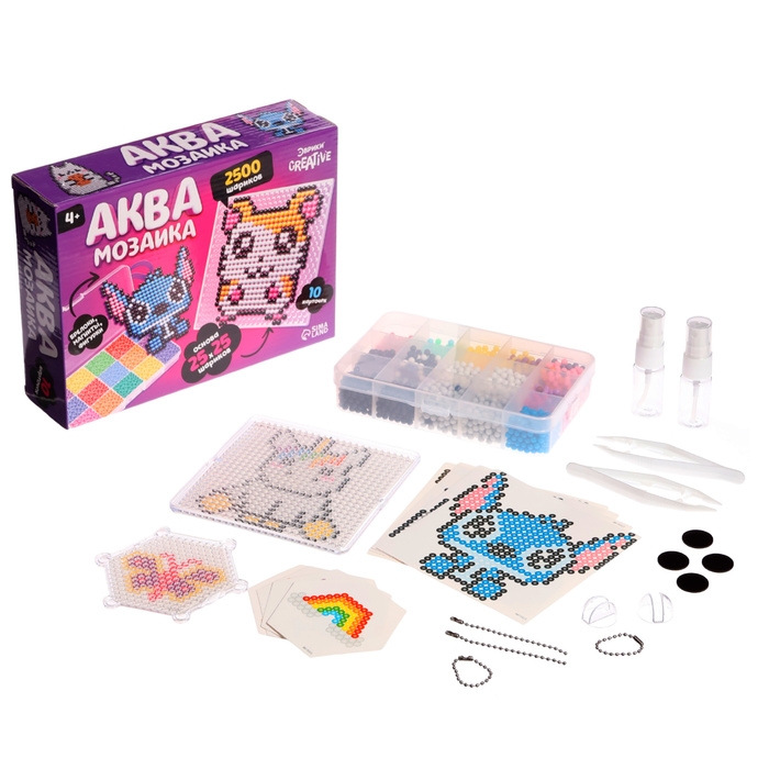 Аквамозаика в контейнере, 2500 шариков, 10 трафаретов, 2 основы