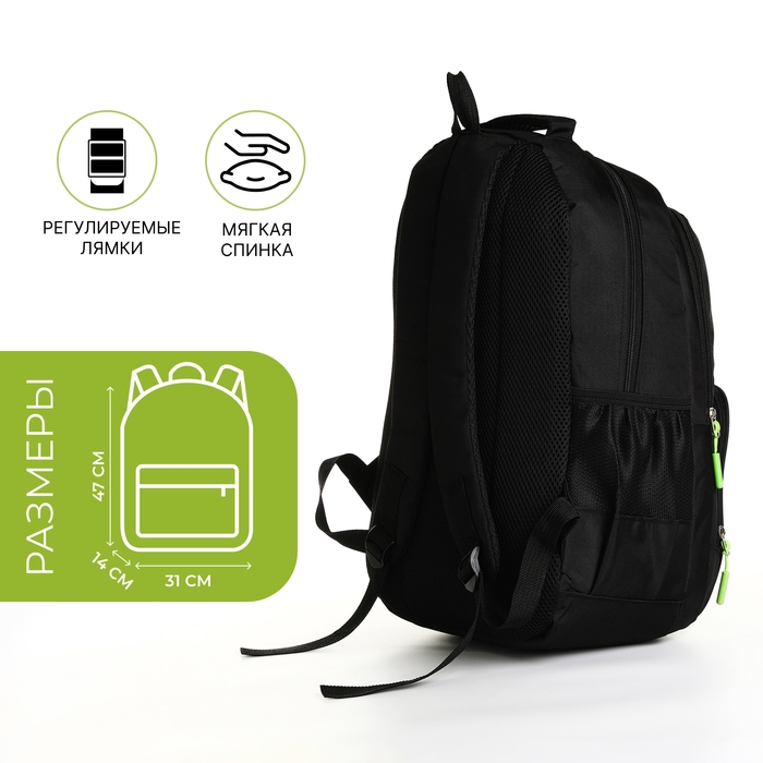 Рюкзак школьный на молнии, 4 кармана, цвет чёрный/зелёный