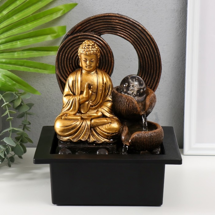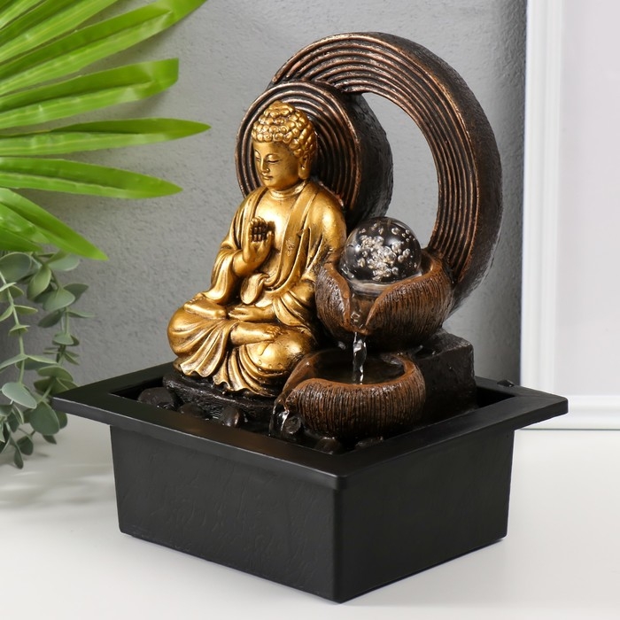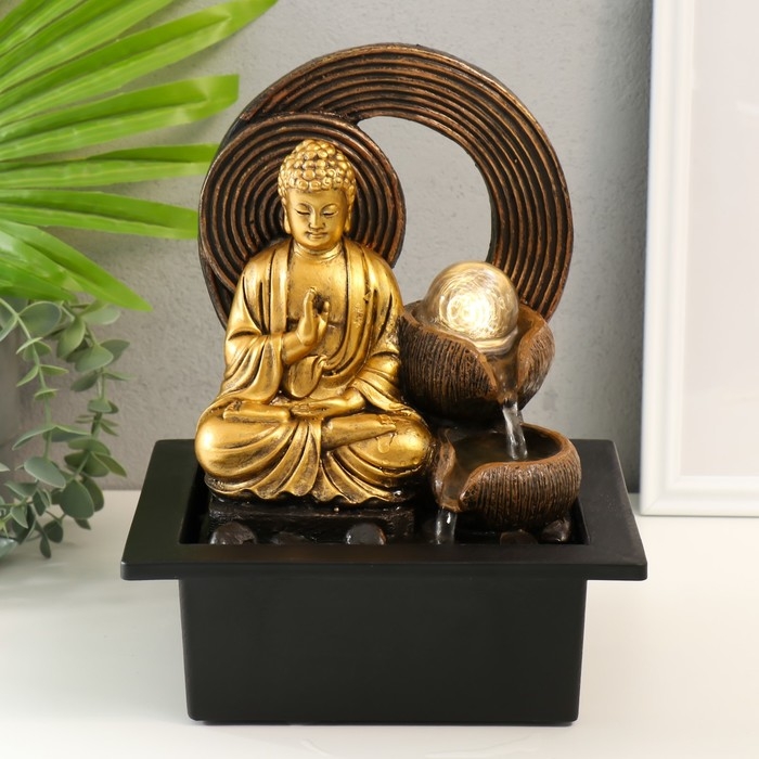 Фонтан настольный от сети, подсветка "Золотой Будда у фонтана с кольцами" 21х17,5х26 см