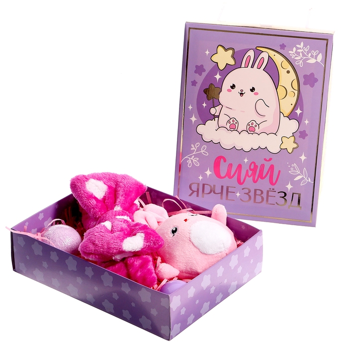 Подарочный набор «Сияй ярче звёзд» — это идеальный подарок для детей, который принесёт радость и удивление. В комплект входят блеск для губ, бомбочка для ванн, заколки, мягкая игрушка и повязка на голову. Каждый элемент набора тщательно подобран для создания волшебного настроения.
