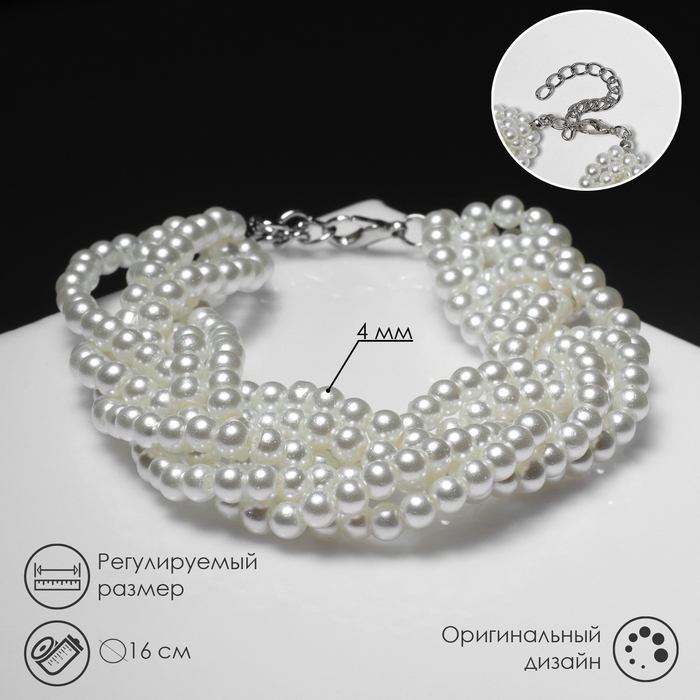Браслет жемчуг «Жгут», 6 нитей, бусины №4, цвет молочный в серебре