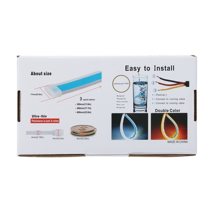 - Набор из 2 штук: вы получаете две светодиодные ленты с функцией поворотников, что позволит установить их на обе стороны автомобиля.