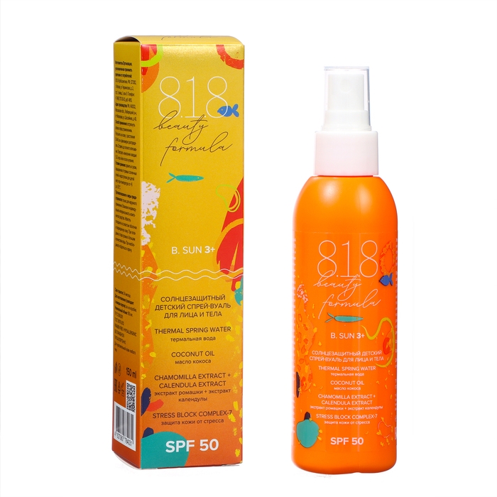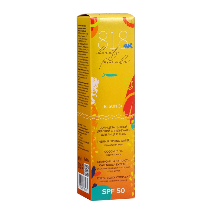Солнцезащитный детский спрей 818 для лица и тела упакован в удобный флакон объемом 150 мл. Он подходит для ежедневного использования и может быть нанесен как на лицо, так и на тело.