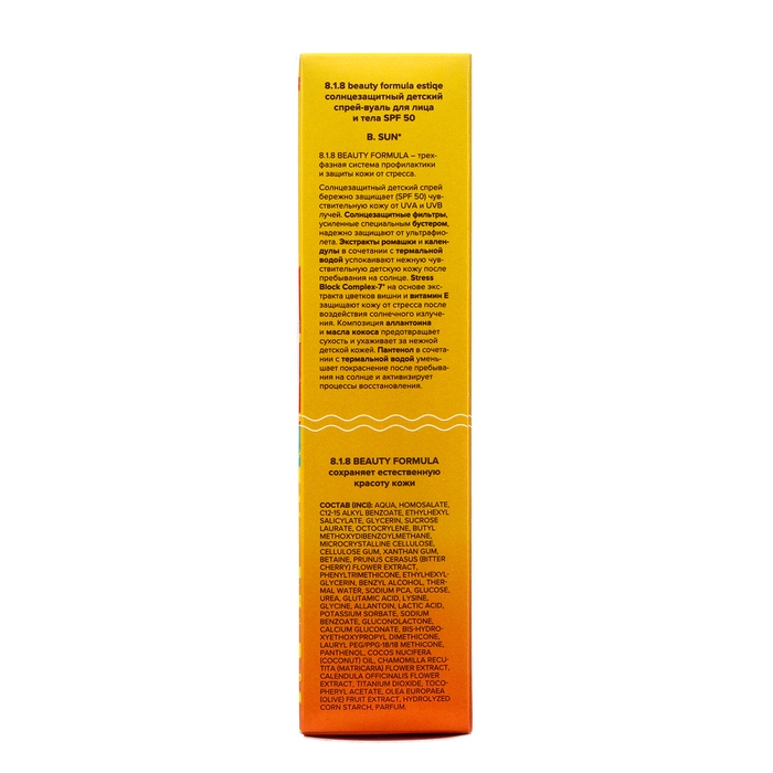 Солнцезащитный детский спрей 818 для лица и тела - это продукт, предназначенный для защиты кожи от вредного воздействия ультрафиолетовых лучей. Он разработан специально для детей и обладает высокой степенью защиты от солнца.