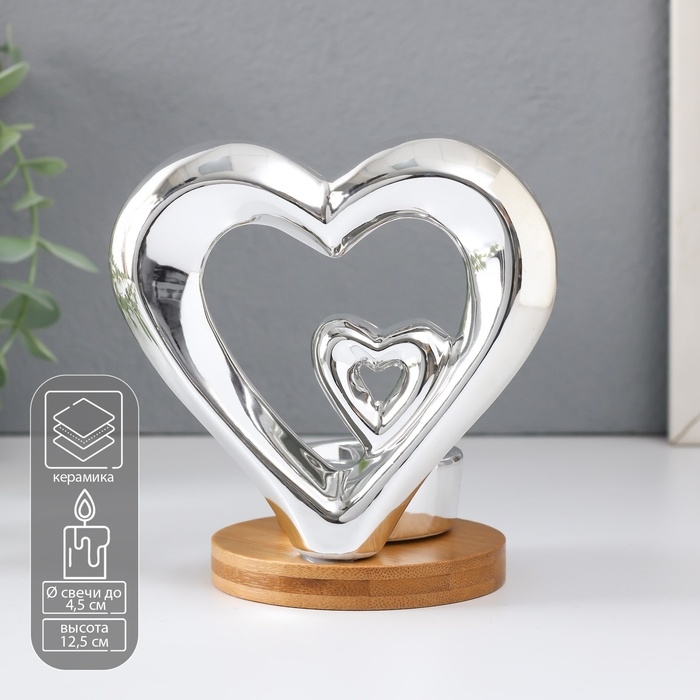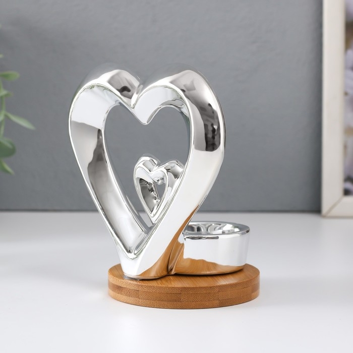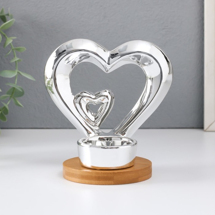 Подсвечник керамика на 1 свечу "Два сердца" серебро 11х8х12,5 см