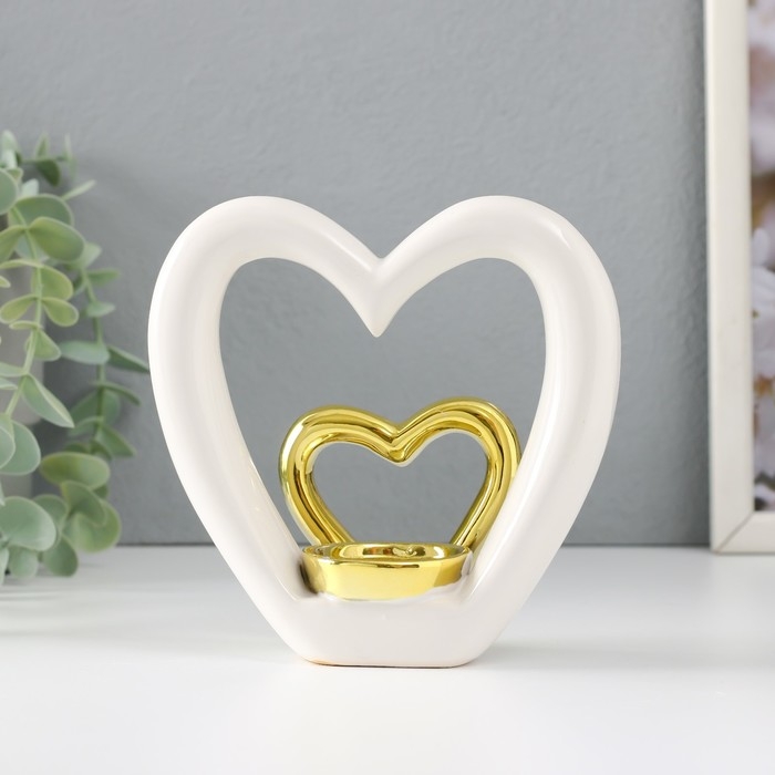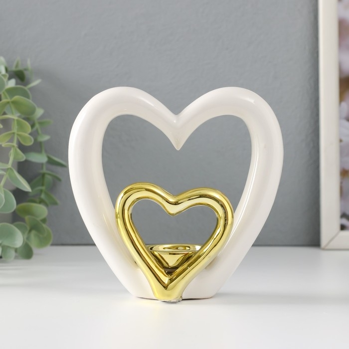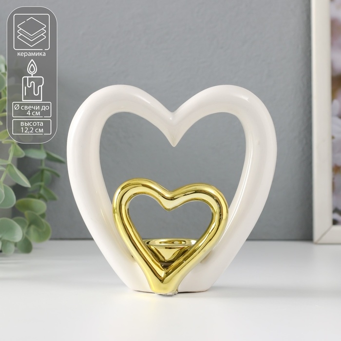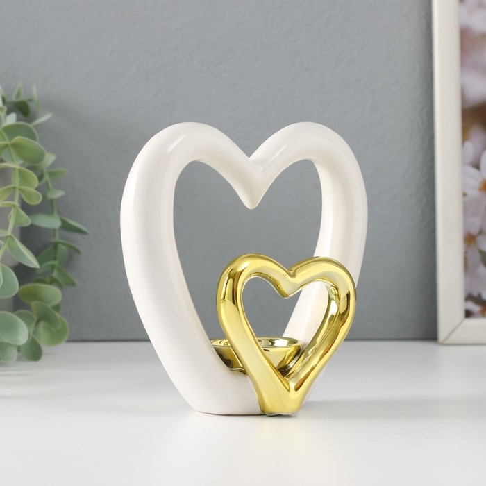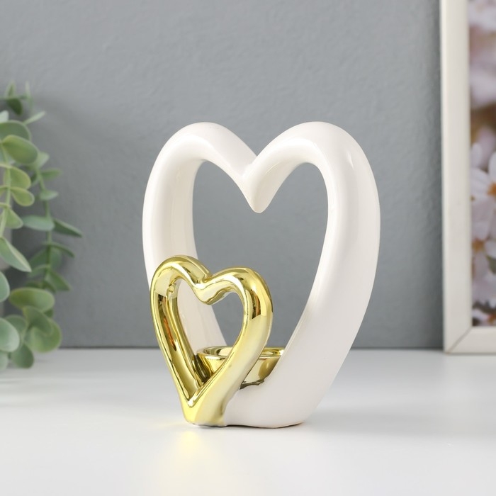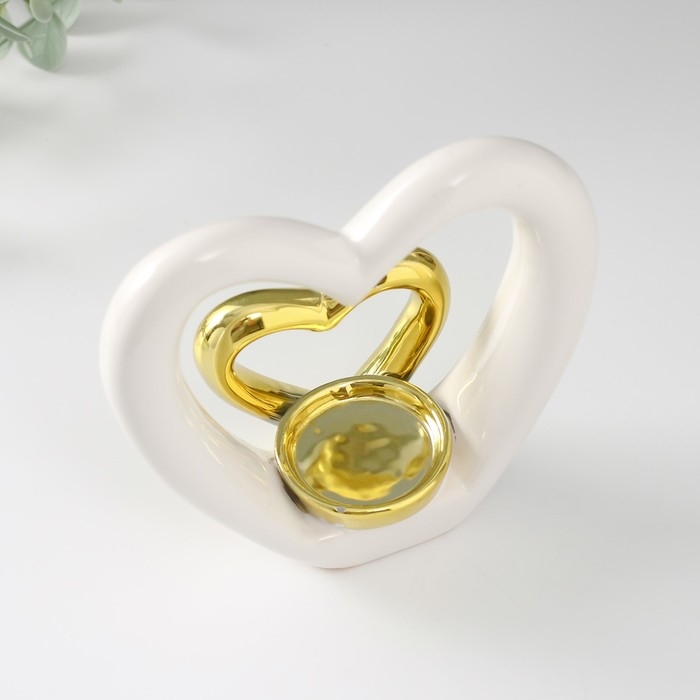 Подсвечник керамика на 1 свечу "Сердце в сердце" белое с золотом 12,7х5,5х12,2 см