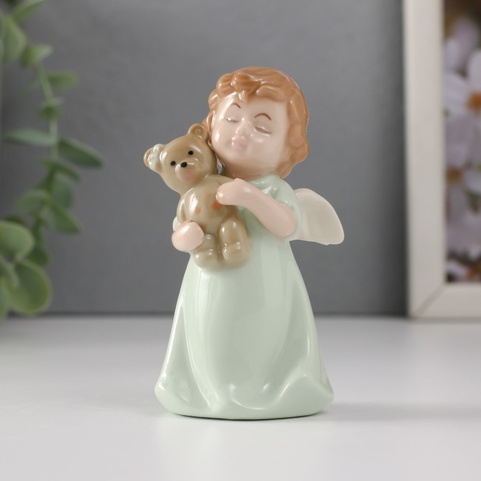 Сувенир керамика "Малышка-ангел в зелёном платье с медвежонком" 5х4х9 см