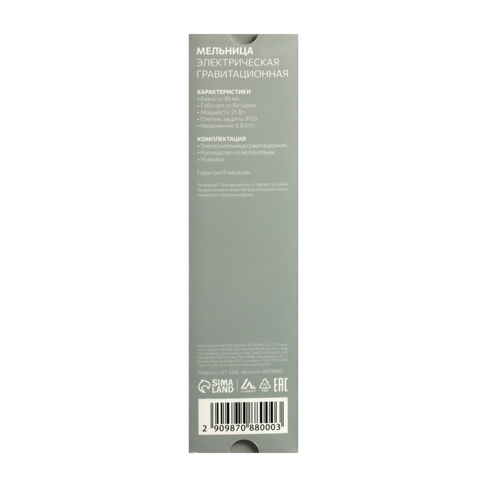 Мельница электрическая Luazon LET-002, металл, от батареек, серебристая