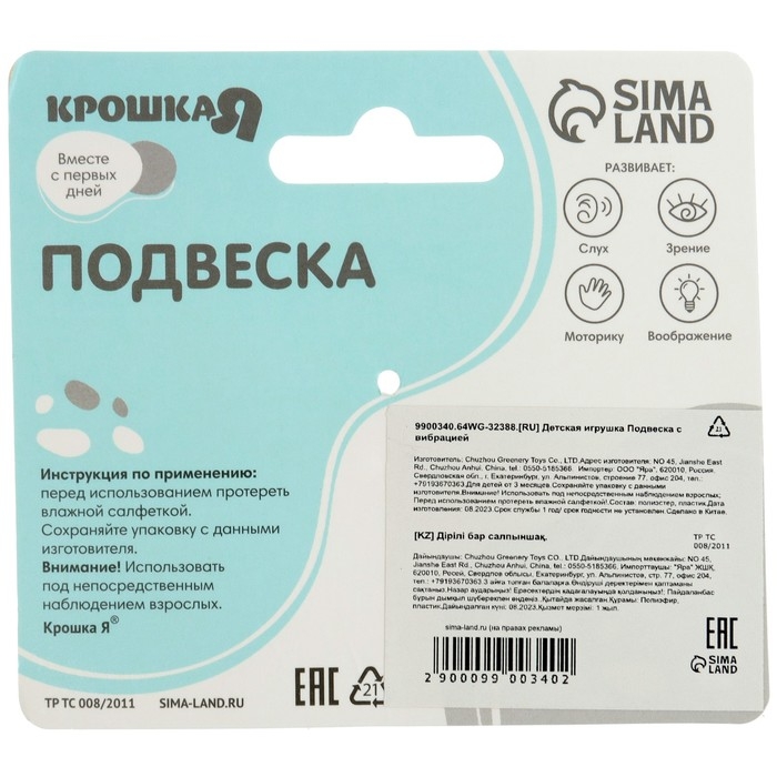 Соответствует требованиям безопасности детской продукции. Рекомендуется детям от 0 месяцев. Развивающая игрушка-подвеска "Крошка Я" станет отличным подарком на выписку!