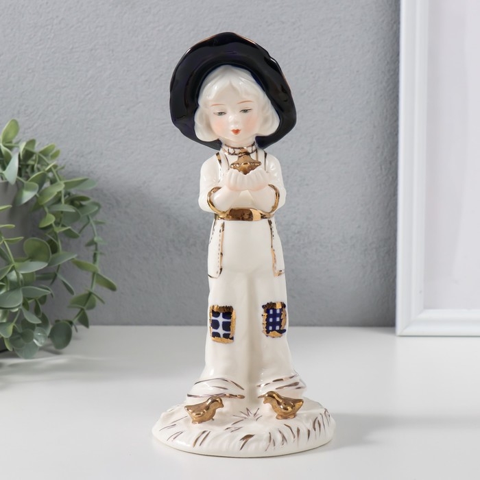 Сувенир керамика "Девочка с птичкой в ладошках, в шляпке" кобальт 9,5х9,7х22 см