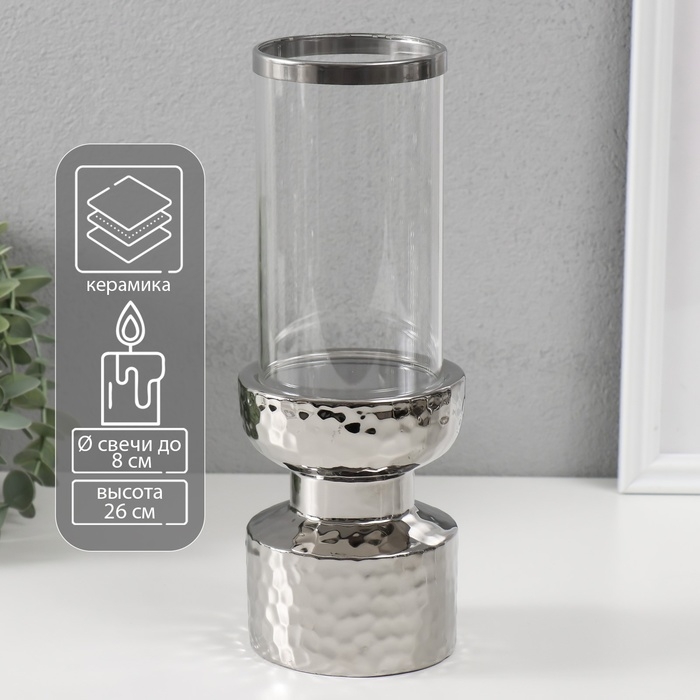 Подсвечник керамика, стекло на 1 свечу "Омут" d=8 см серебро 9,5х9,5х26 см