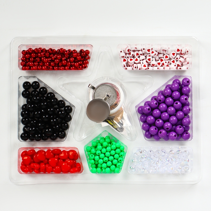 - Виды бусин в наборе: прозрачные, зелёные, красный металлик, чёрные, фиолетовые, белые с красными сердечками и красные в виде сердечек.