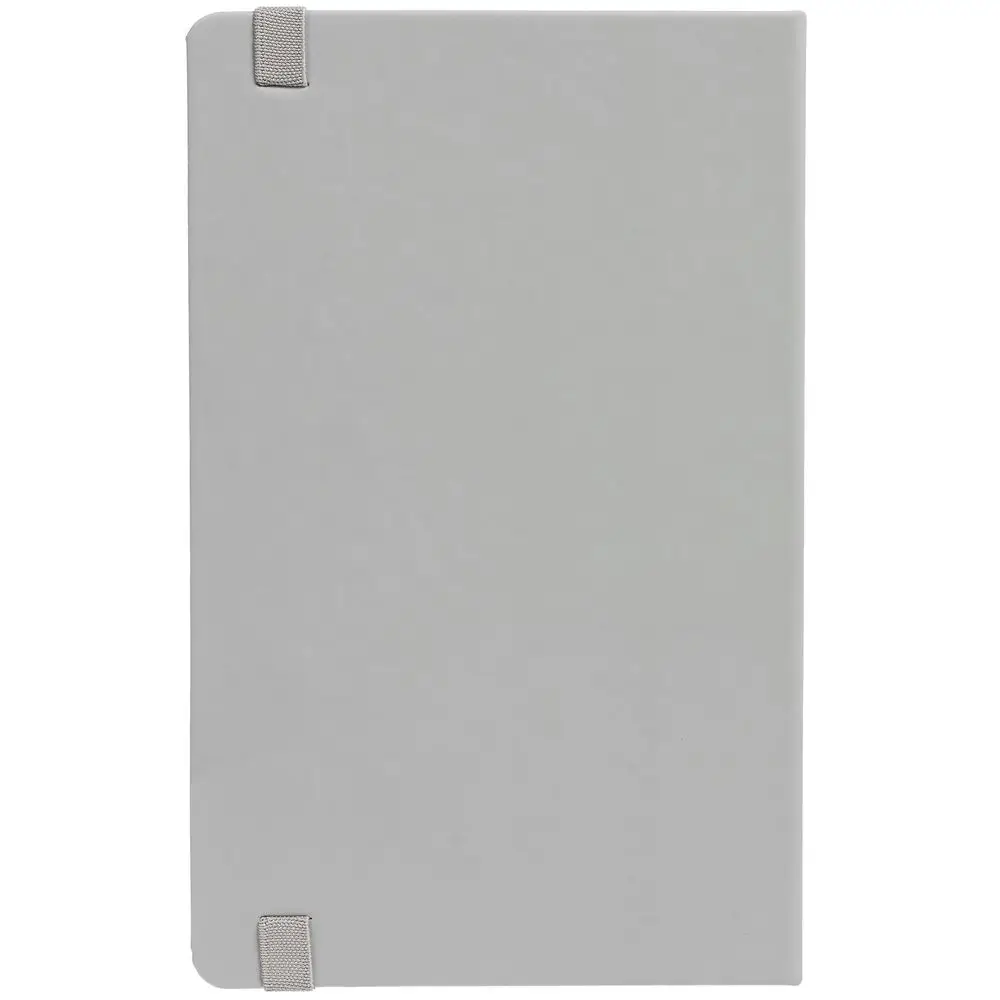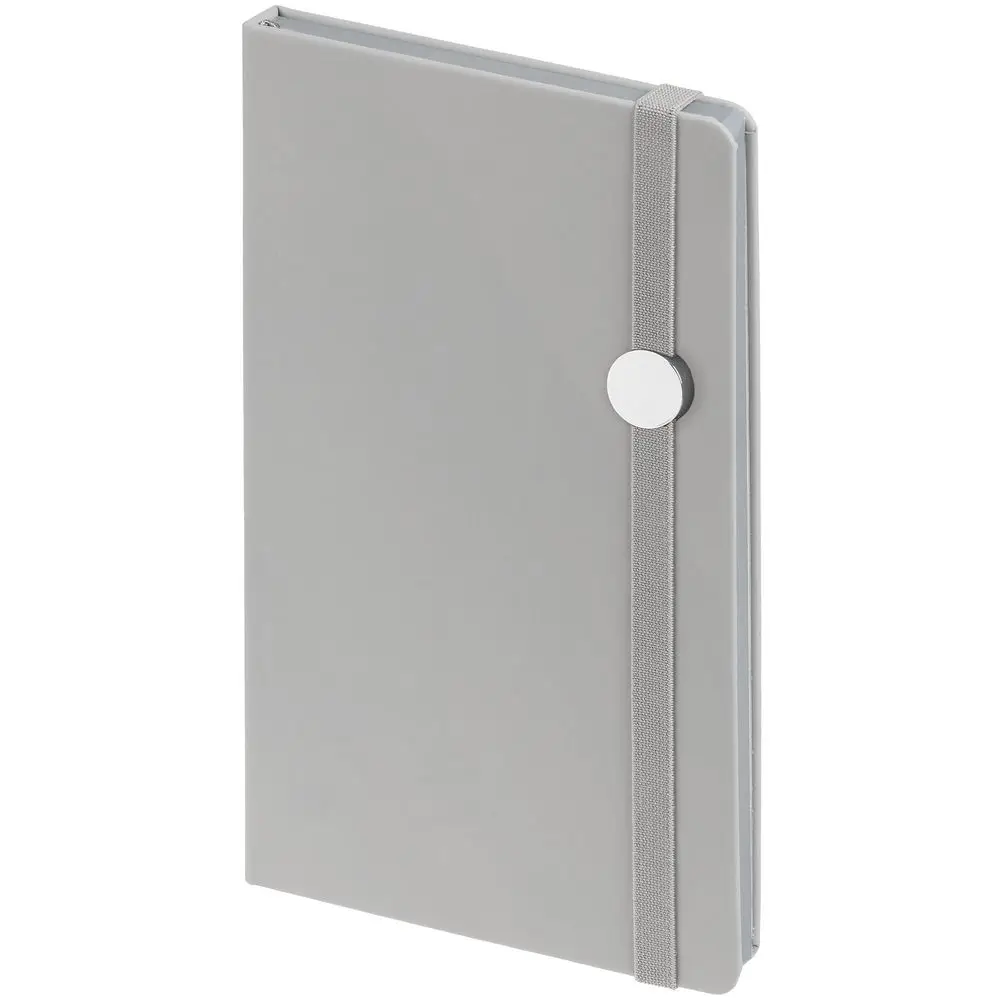 Блокнот в твердой обложке, выполнен из материала Soft Touch, серый СС, дополнен резинкой и ляссе в цвет обложки.