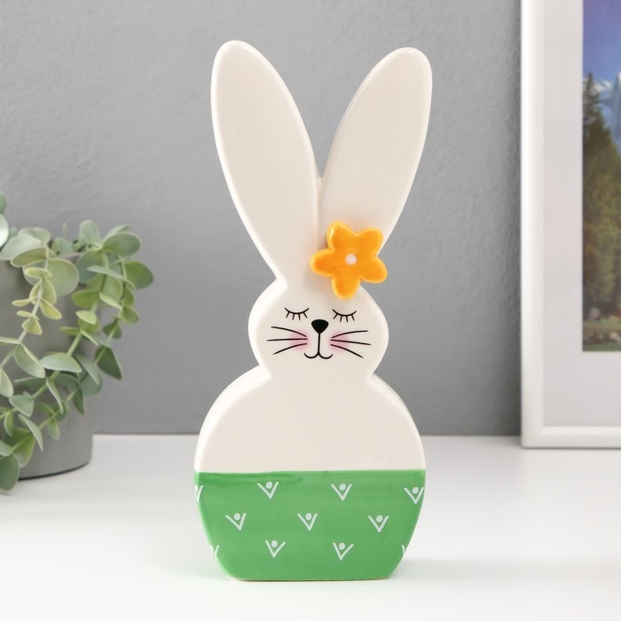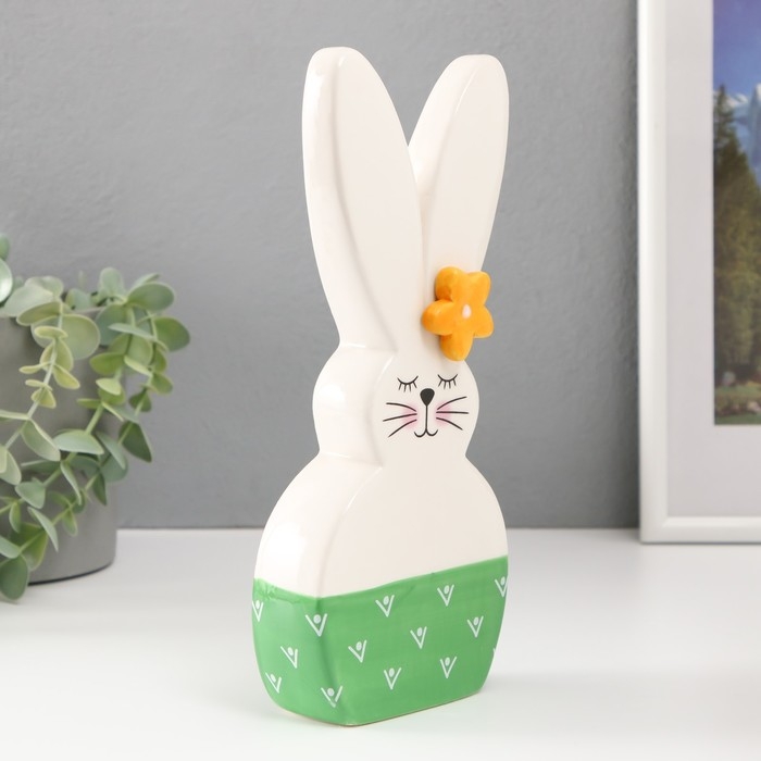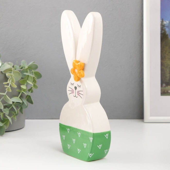 Сувенир керамика "Зайка спящий, с ромашкой на ухе" бело-зелёный 10,4х4,3х23,7 см