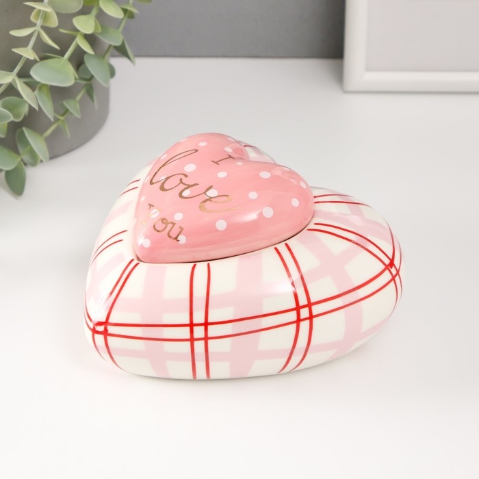 Шкатулка керамика "Розовое сердце в горошек, в клеточку" 15,7х15,3х8,2 см