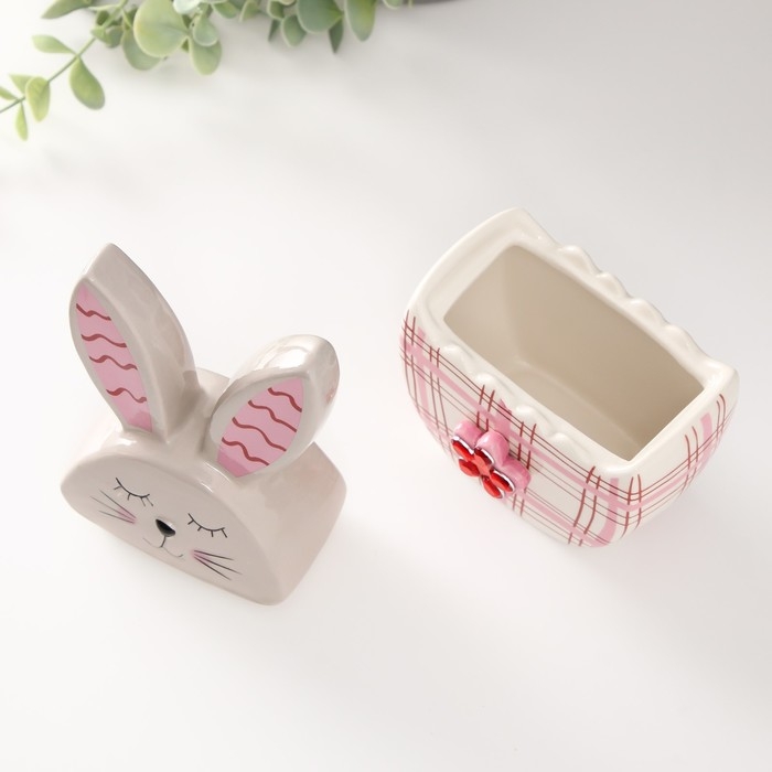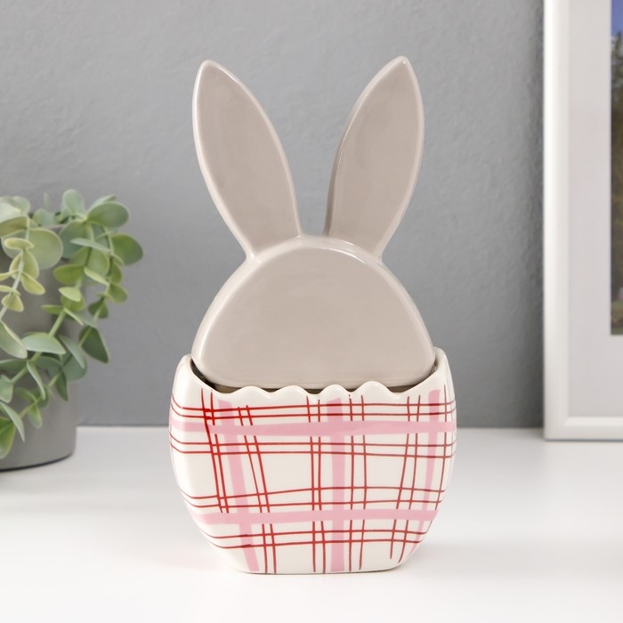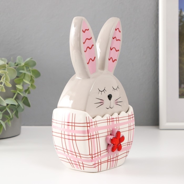 Шкатулка керамика "Зайка в яйце в клеточку, с цветком" серо-красный 11,8х7,2х20,8 см