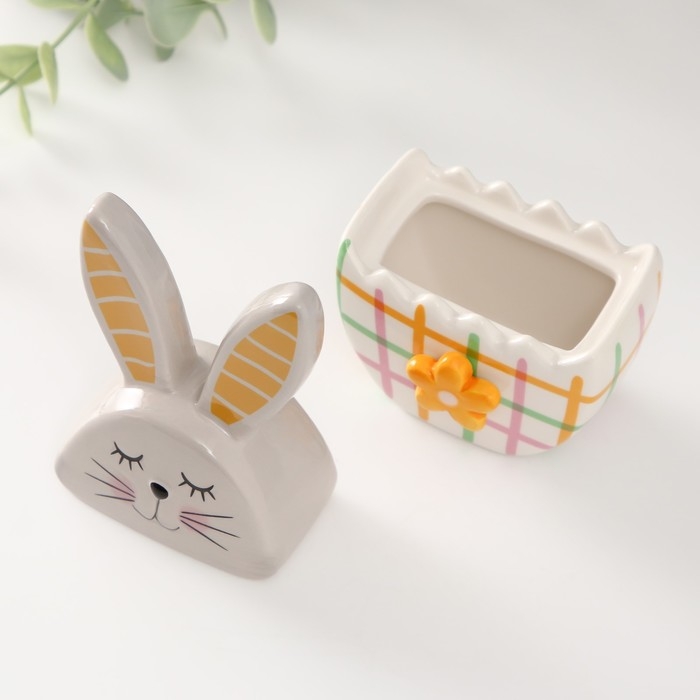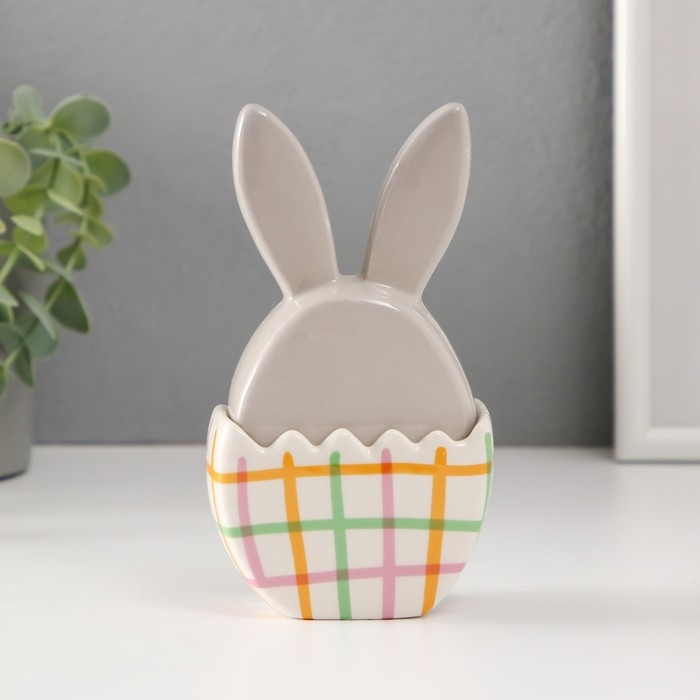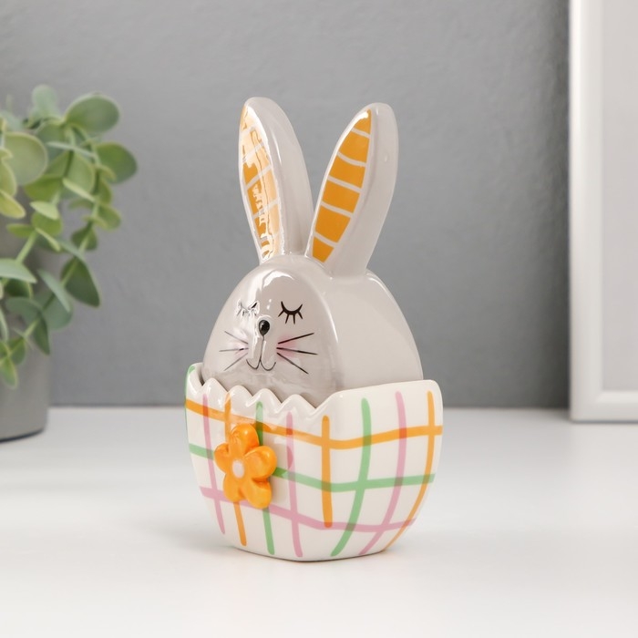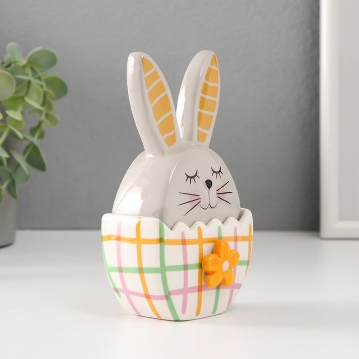 Шкатулка керамика "Зайка в яйце в клеточку, с цветком" серо-жёлтый 8х5,4х14,2 см