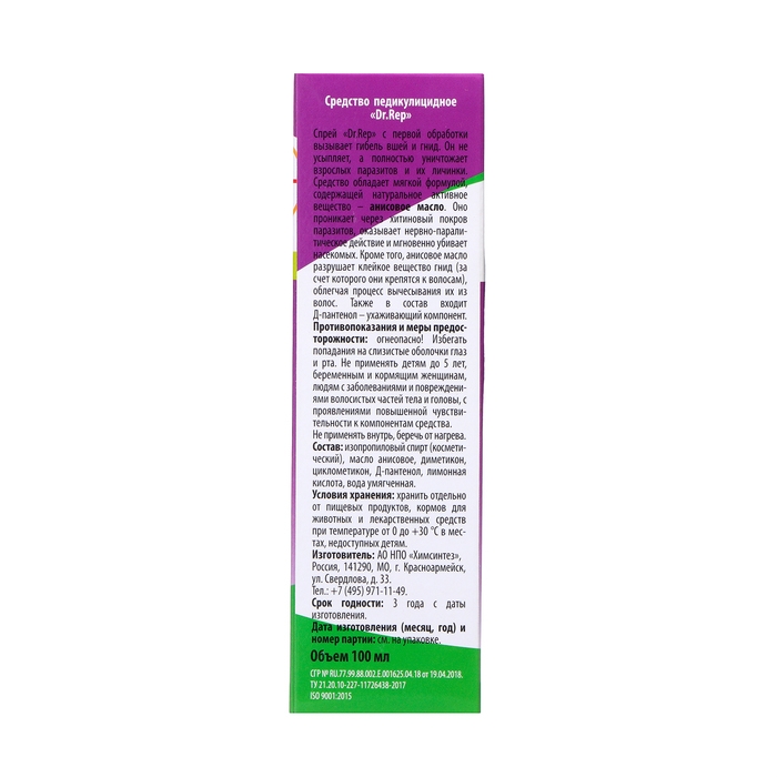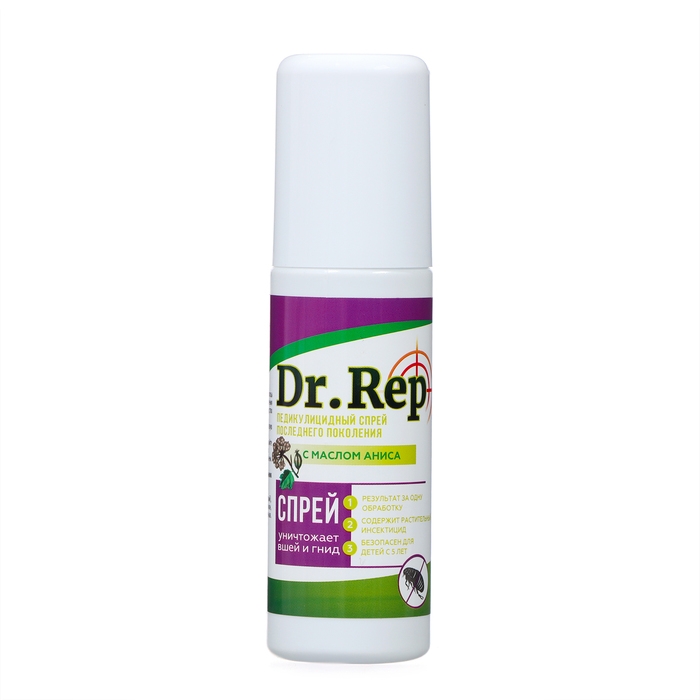Спрей «Dr.Rep» с первой обработки вызывает гибель вшей и гнид. Он не усыпляет, а полностью уничтожает взрослых паразитов и их личинки. Средство обладает мягкой формулой, содержащей натуральное активное вещество – анисовое масло. Оно проникает через хитиновый покров паразитов, оказывает нервно - паралитическое действие и мгновенно убивает насекомых. Кроме того, анисовое масло разрушает клейкое вещество гнид (за счет которого они крепятся к волосам), облегчая процесс вычесывания их из волос. Также в состав входит Д-пантенол - ухаживающий компонент.