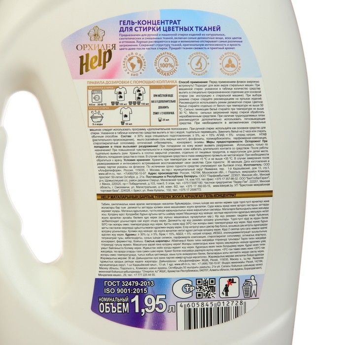 Гель концентрат Help для стирки цветных тканей 1,95 л - это эффективное и безопасное средство для стирки цветных вещей. Он бережно очищает ткани, сохраняя их яркость и насыщенность цветов. Гель безопасен для окружающей среды, не содержит фосфатов, хлора и других вредных химических веществ.