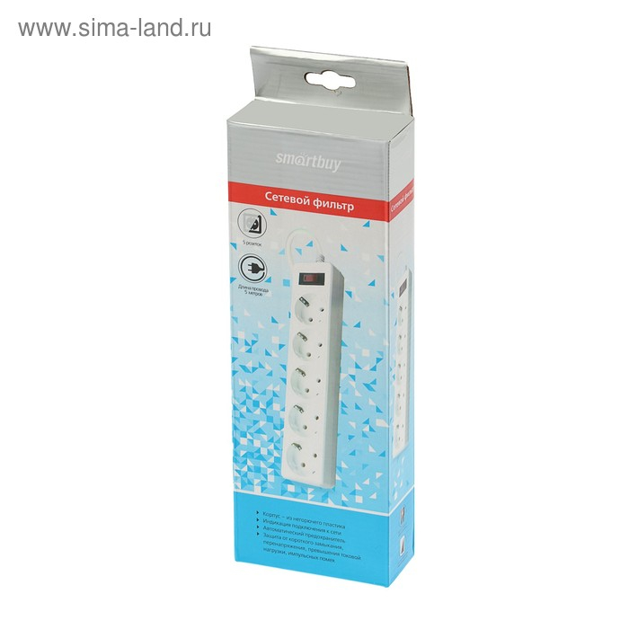 Сетевой фильтр Smartbuy, 5 розеток, 5 м, 10 А, 2200 Вт, с з/к, белый