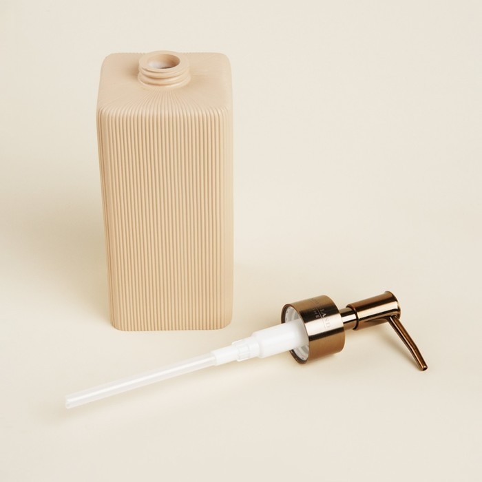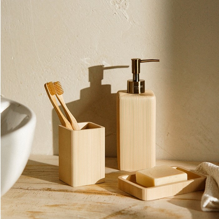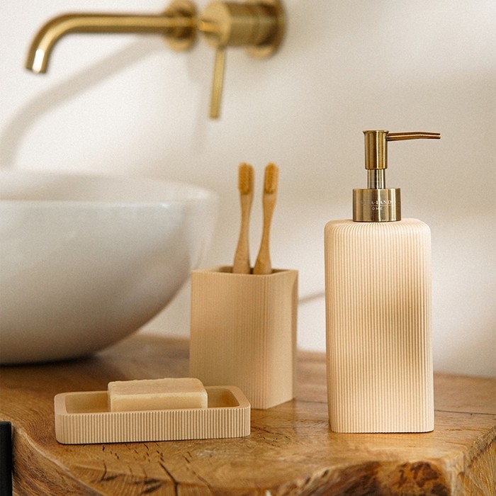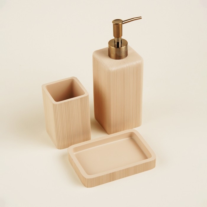 Набор выполнен из высококачественного полирезина и пластика, что обеспечивает долговечность и устойчивость к влаге. Однотонный дизайн в нежном бежевом цвете гармонично впишется в любой интерьер, придавая вашей ванной комнате современный и утончённый вид.