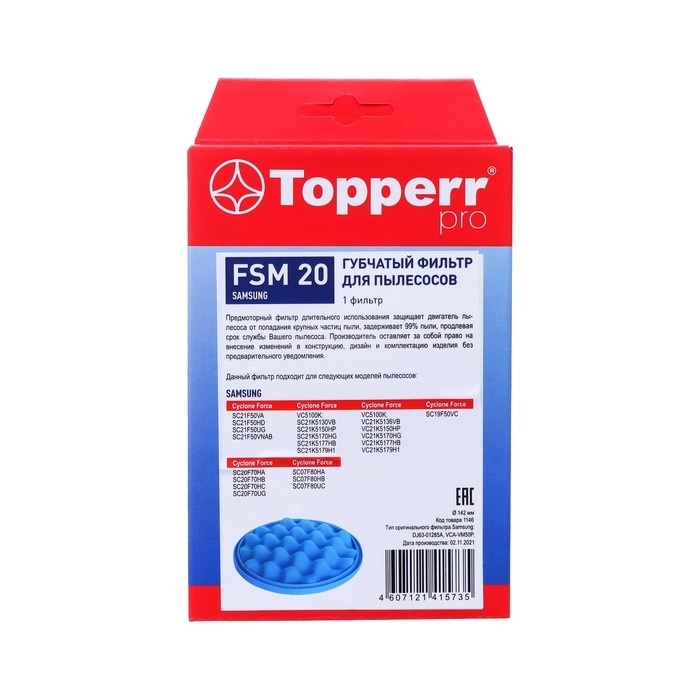 Фильтр легко устанавливается и подходит для большинства моделей пылесосов Samsung. Регулярная замена фильтра поможет сохранить высокую эффективность вашего пылесоса и продлить его срок службы. Выберите фильтр Topperr для пылесосов Samsung и наслаждайтесь идеальной чистотой вашего дома.
