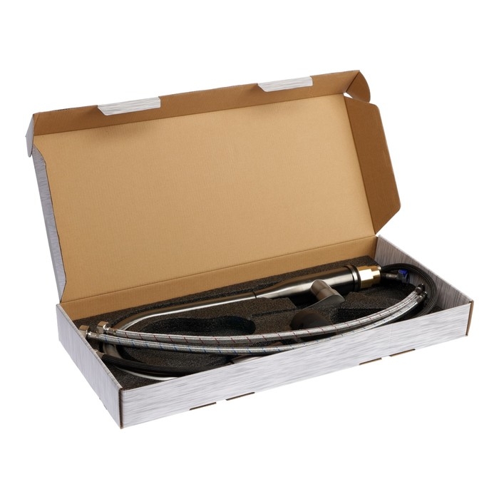 Вытяжной излив добавит функциональности смесителю - можно вымыть объемную посуду, дотянуться до труднодоступных мест и любого содержимого мойки. Также, аэратор имеет два режима подачи воды.