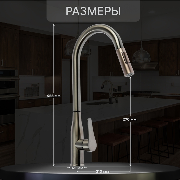 Смеситель для кухни ZEIN Z1752, нержавеющая сталь, с выдвижной лейкой, 2 режима, цвет сатин