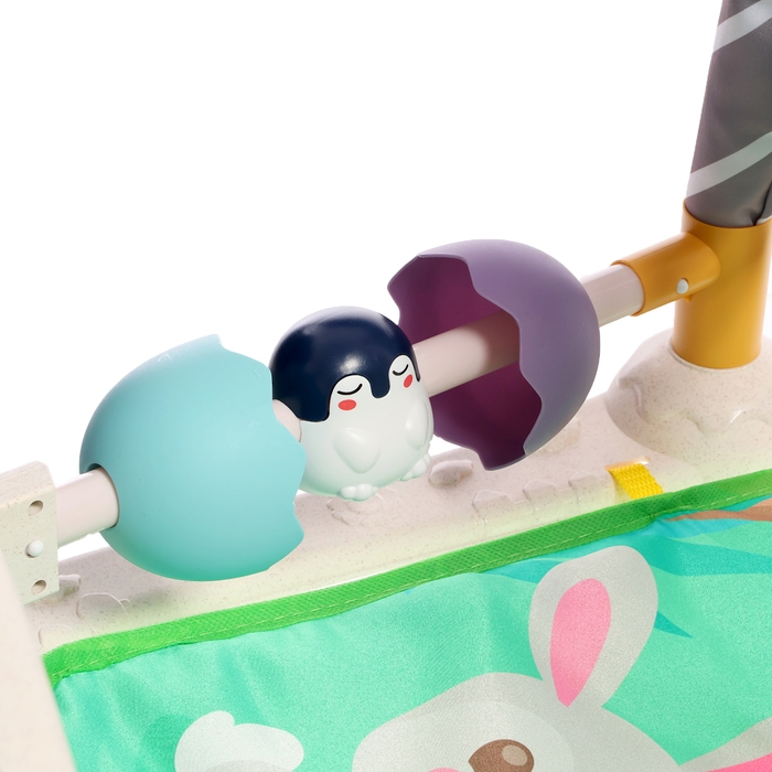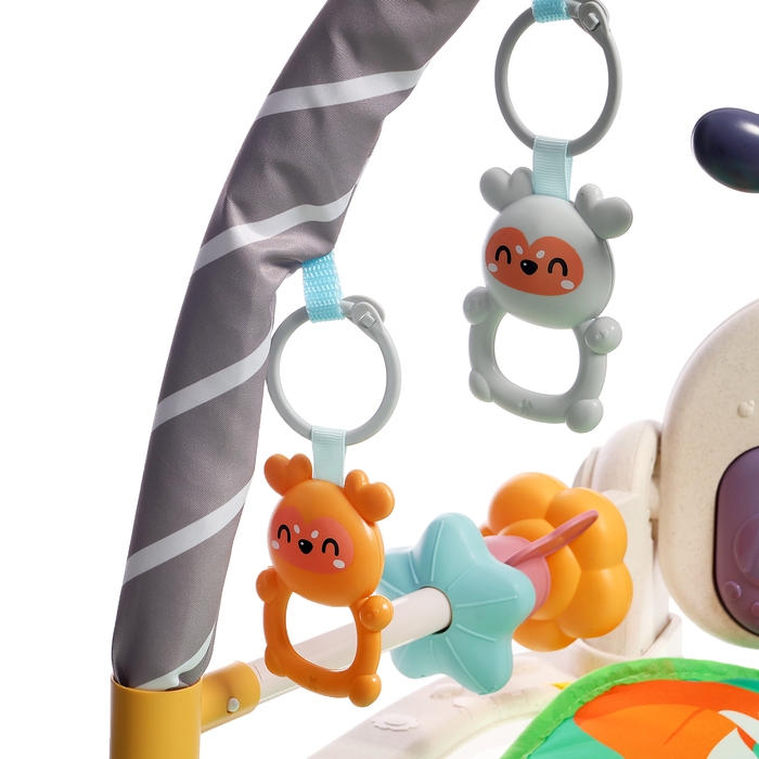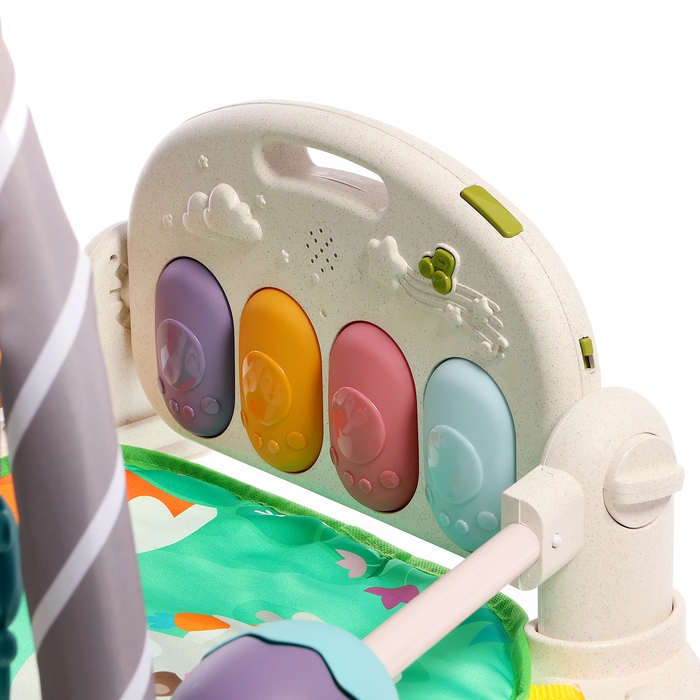 Яркий музыкальный коврик — это настоящий развивающий центр для малыша. Заниматься на нём можно с 3 месяцев. С таким ковриком кроха быстрее научится держать головку и управлять телом, фокусировать взгляд на движущемся предмете и находить источник звука, а ещё потренирует тактильные навыки и мелкую моторику.