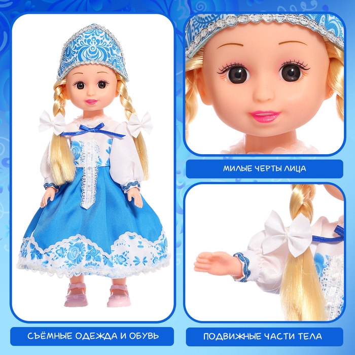 - Множество стилей. Ваш ребёнок сможет творчески подходить к созданию образов, наряжая куклу в русское народное платье, кокошник и обувь. Они с лёгкостью надеваются и снимаются.