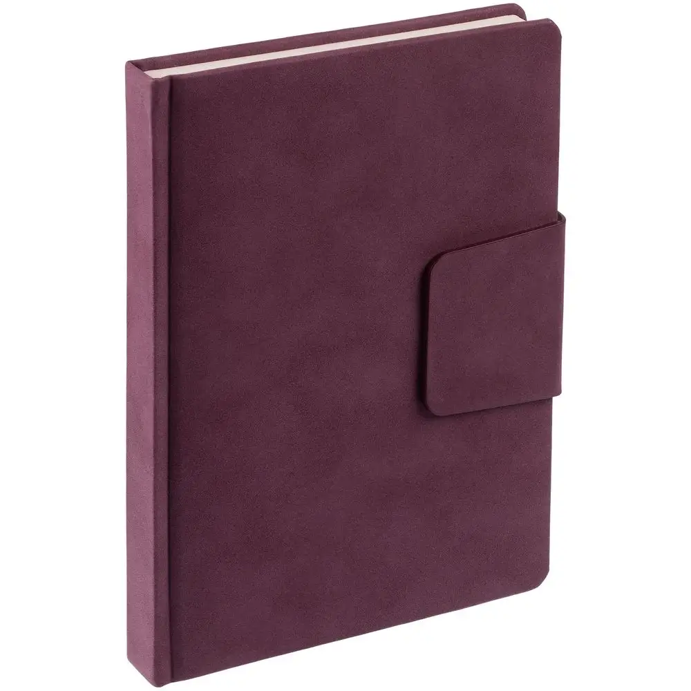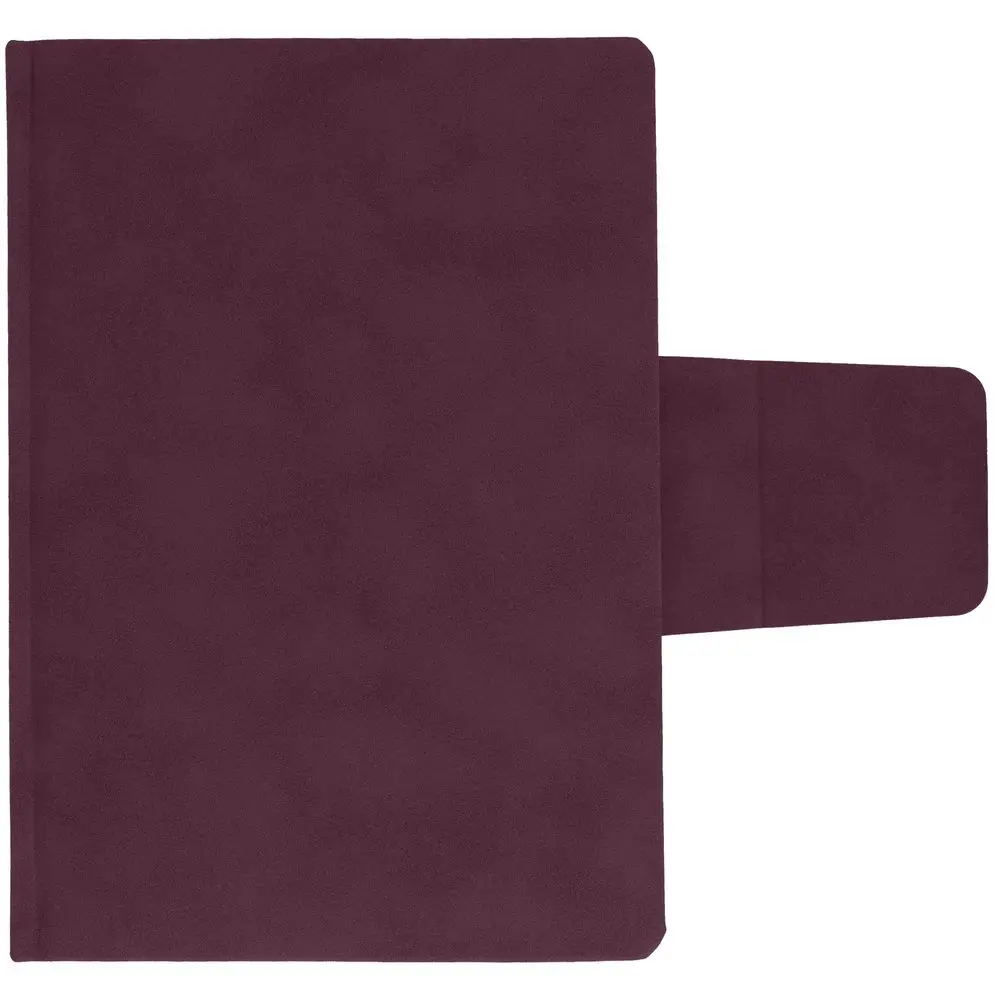 Ежедневник с твердой обложкой c поролоном, выполнен из материала Nubuck, винный SS, дополнен капталом и ляссе бордового цвета. Застежка — хлястик на магните.