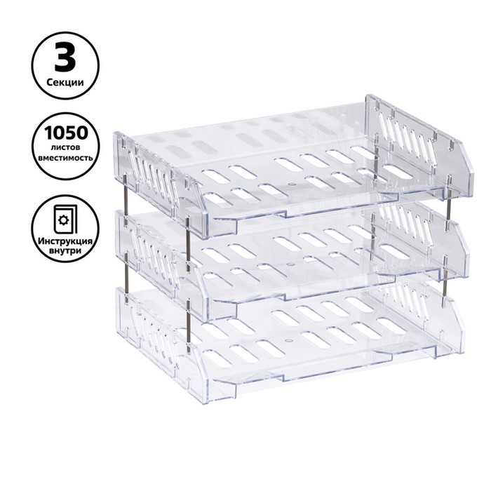 Набор лотков для бумаг горизонтальных с широкой загрузкой, "Сити", 3 шт., на металлических стержнях, прозрачный