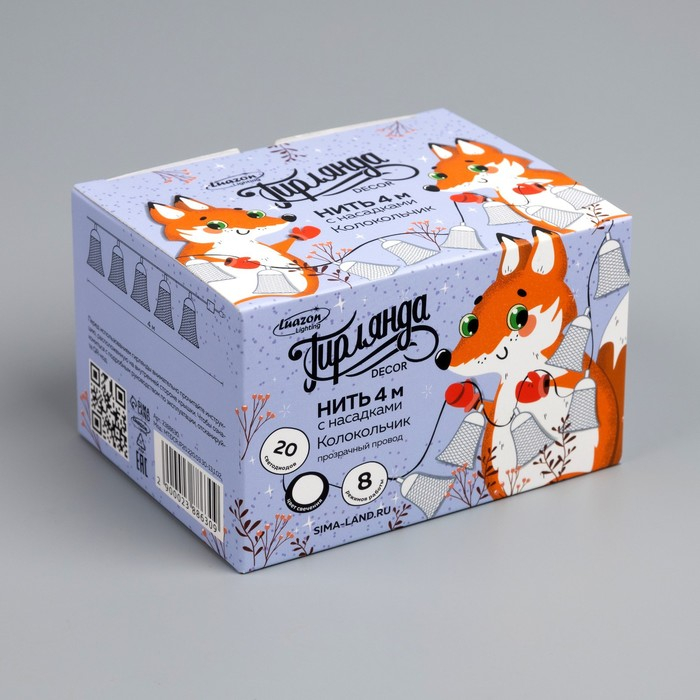 Гирлянда «Нить» 4 м с насадками «Колокольчик», IP20, прозрачная нить, 20 LED, свечение белое, 8 режимов, 220 В
