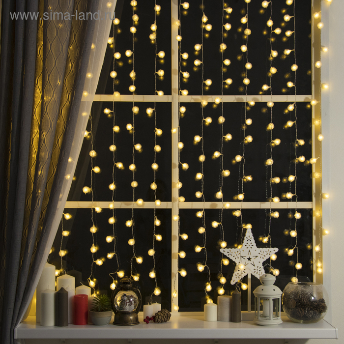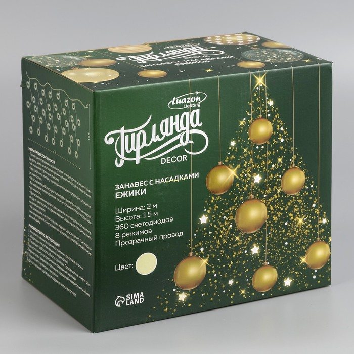 Гирлянда «Занавес» 2 × 1.5 м с насадками «Ёжики», IP20, прозрачная нить, 360 LED, свечение тёплое белое, 8 режимов, 220 В